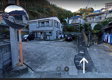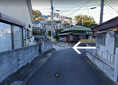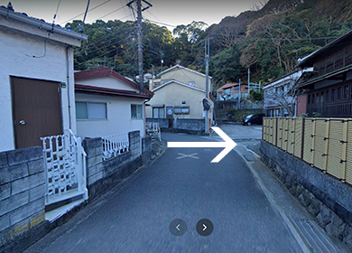 貸別荘「れもん」は入り口が道路側ではなく裏手となっております。建物手前のカーブのミラーの脇に入り口へ繋がる小道がありますので、こちらからお入りください。