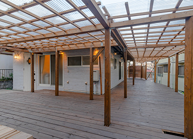 屋根付きのひろびろとしたウッドデッキは、玄関、キッチン、お部屋の大窓に面したコミュニケーションやアクティビティが進むレイアウトになっており、シンクと照明もございますので、BBQやピクニッックを楽しんで頂けます。