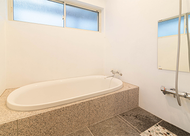 「れもん」のお風呂は白御影石に囲まれた楕円の湯船となっており、レジャーの疲れを癒します。