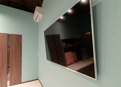 「れもん」のワンルームには大きめのモニターが設置してあります、お連れ様とソファやカーペットでひろびろ動画鑑賞をしたり、ワンルーム一体ならではのキッチンからの見通しで、お子様づれにも好評です。お仕事仲間とのディスカッションにもいかがでしょう。